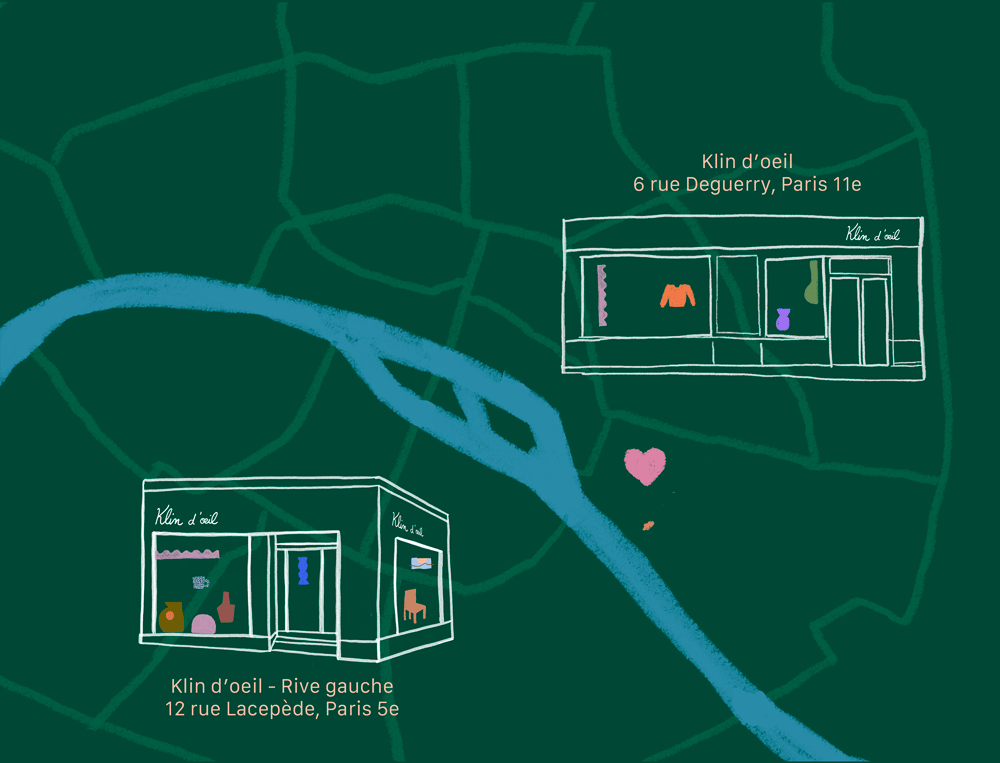 Nous sommes situés dans une petite rue du 11e arr à Paris. Venez découvrir nos 3 façades colorées : La boutique galerie, l’atelier et le café klin.